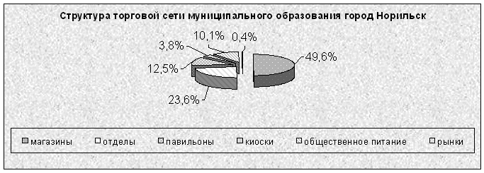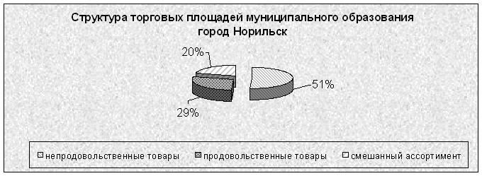 На потребительском рынке муниципального образования город Норильск по состоянию на 1 января 2005 года действует 2 164 предприятий торговли и оказания услуг общественного питания, общей площадью 294 549 кв. м., в том числе: